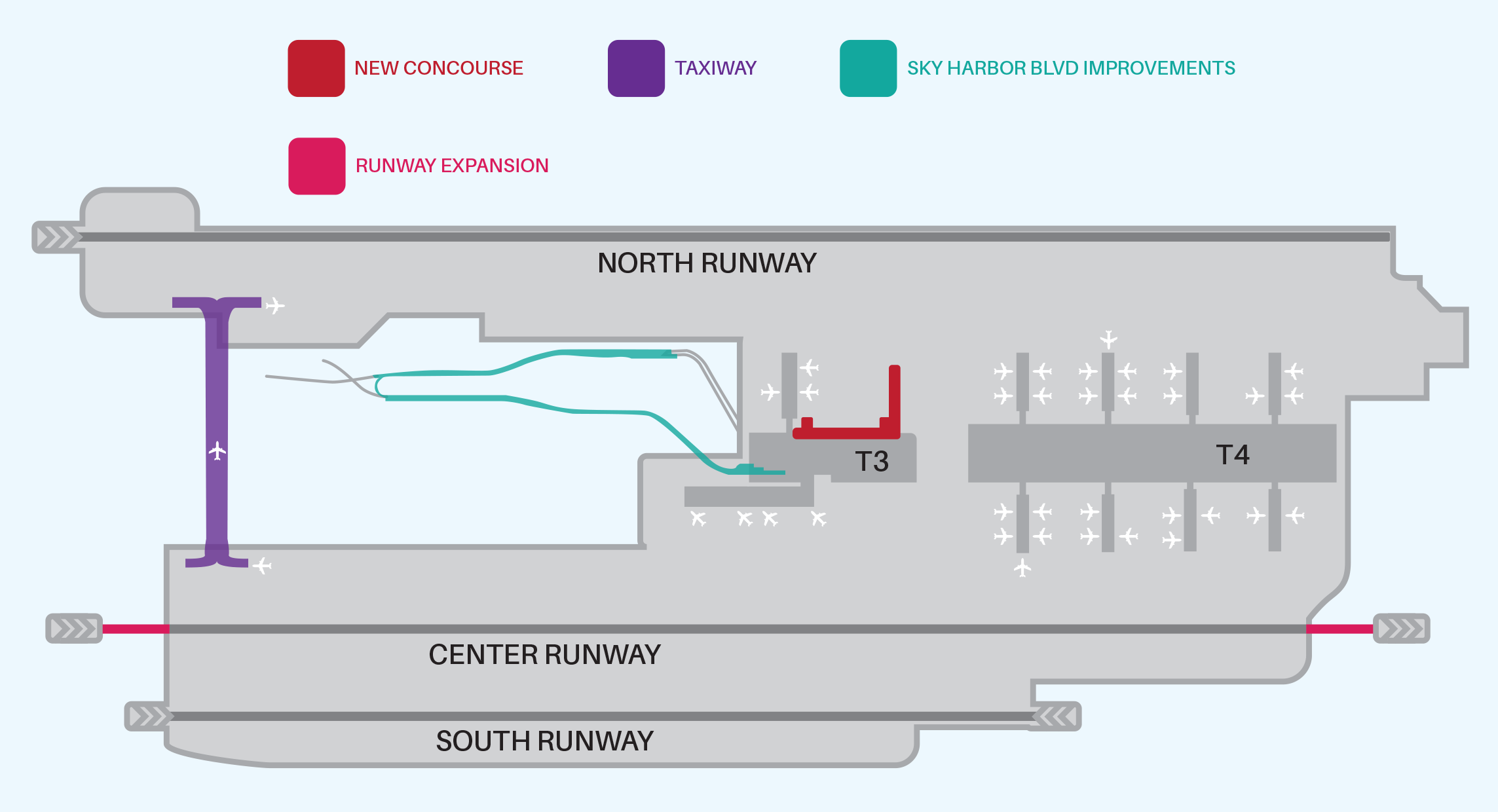 To accomplish these goals, in 2019, Phoenix Sky Harbor developed a 20-year plan that would provide a roadmap for meeting future demand. In 2022, the plan was updated, and near-term goals were identified: