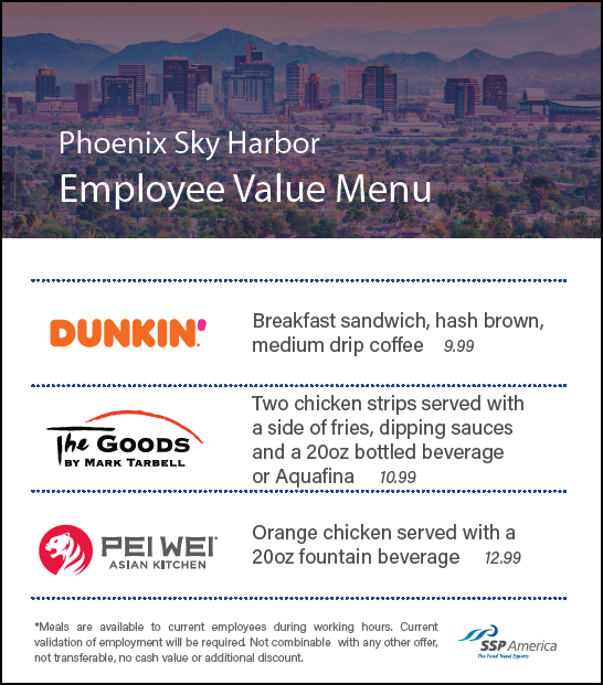 - Phoenix Magazine Cafe and Market in the Rental Car Center offers 10% off beverages and special menu pricing for employees