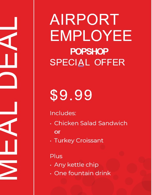 The new Coca-Cola Lounge Popshop, located in Terminal 4, level 3, next to the food court, has a special meal deal offer. Airport employees can purchase a chicken salad sandwich or a turkey croissant plus chips and a fountain drink for $9.99.