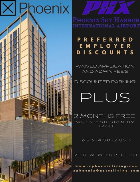 Airport employees can take advantage of a preferred employer discount from X Phoenix as well as additional holiday specials and promotions. Anyone interested in a new downtown Phoenix apartment is welcome to stop by for a tour.