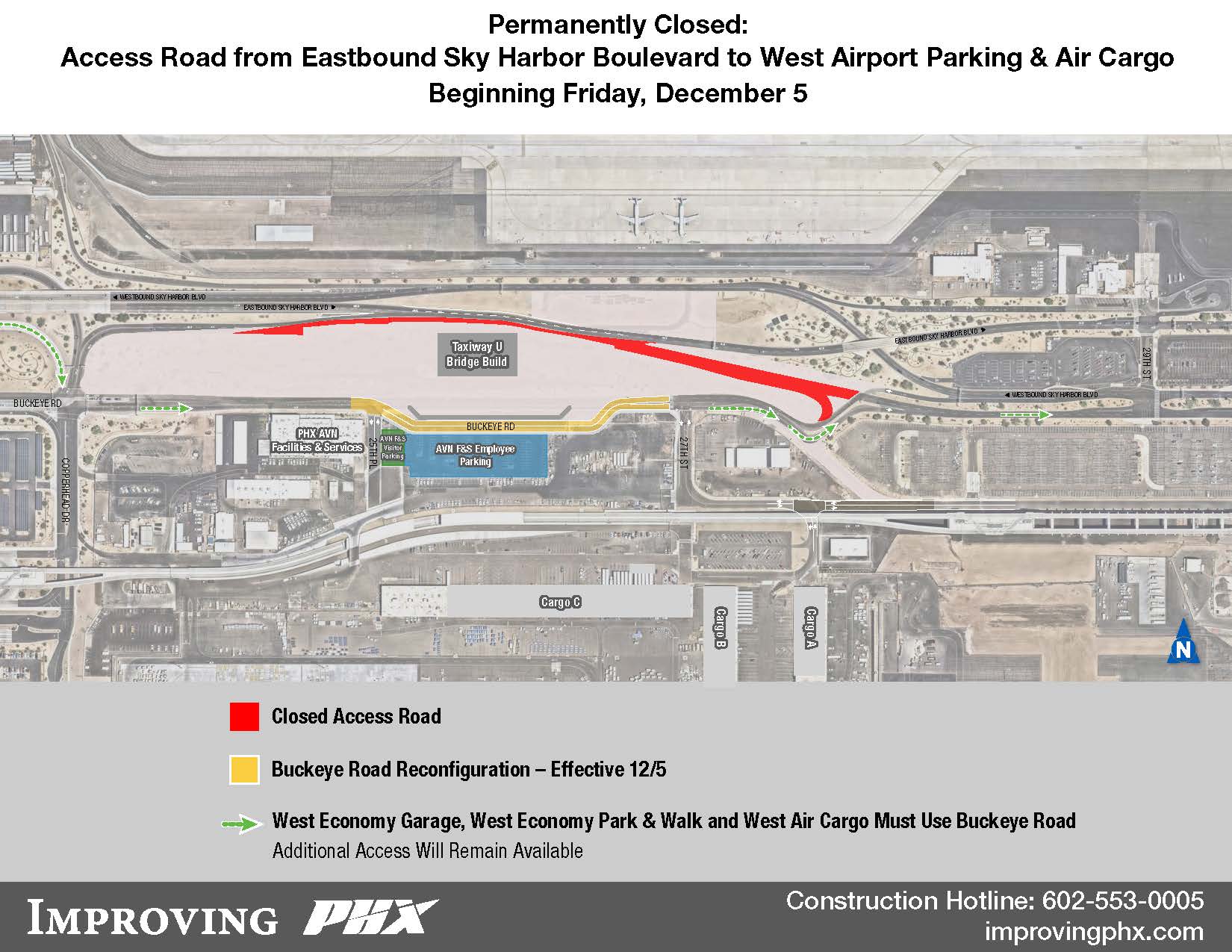 Beginning Friday, Dec. 5, the access road from eastbound Sky Harbor Boulevard leading to West Economy Garage, West Economy Park & Walk, and West Air Cargo will close permanently.